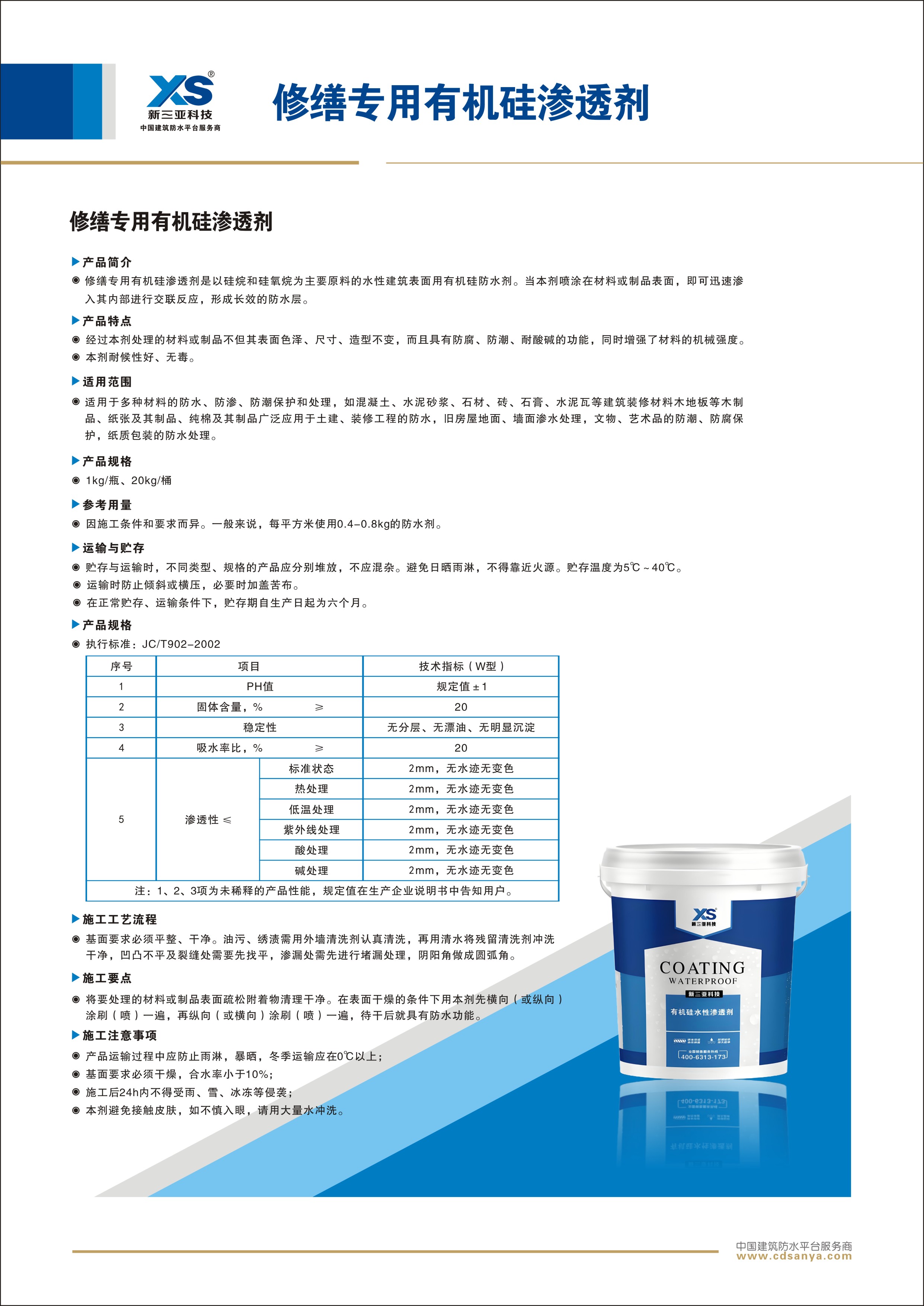 修繕專用有機(jī)硅滲透劑是以硅烷和硅氧烷為主要原料的水性建筑表面用有機(jī)硅防水劑。當(dāng)本劑噴涂在材料或制品表面,即可迅速滲入其內(nèi)部進(jìn)行交聯(lián)反應(yīng),形成長(zhǎng)效的防水層。