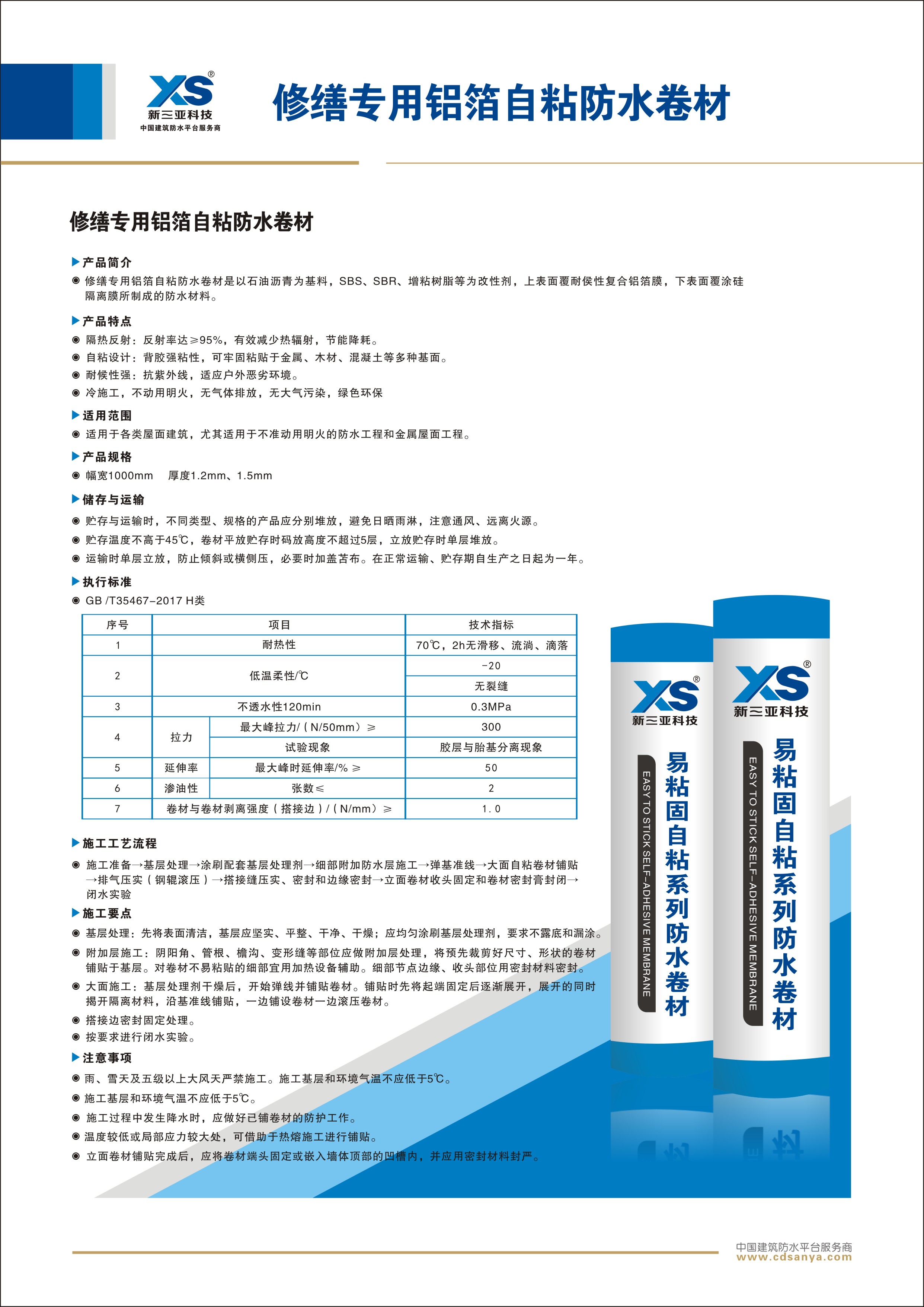 產(chǎn)品簡介 修繕專用鋁箔自粘防水卷材以石油瀝青為基料,SBS、SBR、增粘樹脂等為改性劑,上表面覆耐侯性復(fù)合鋁箔膜,下表面覆涂硅隔離膜所制成的防水材料。 規(guī)格:1.2mm 1m×20 m | ![]() |